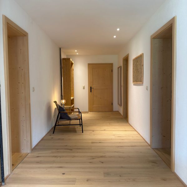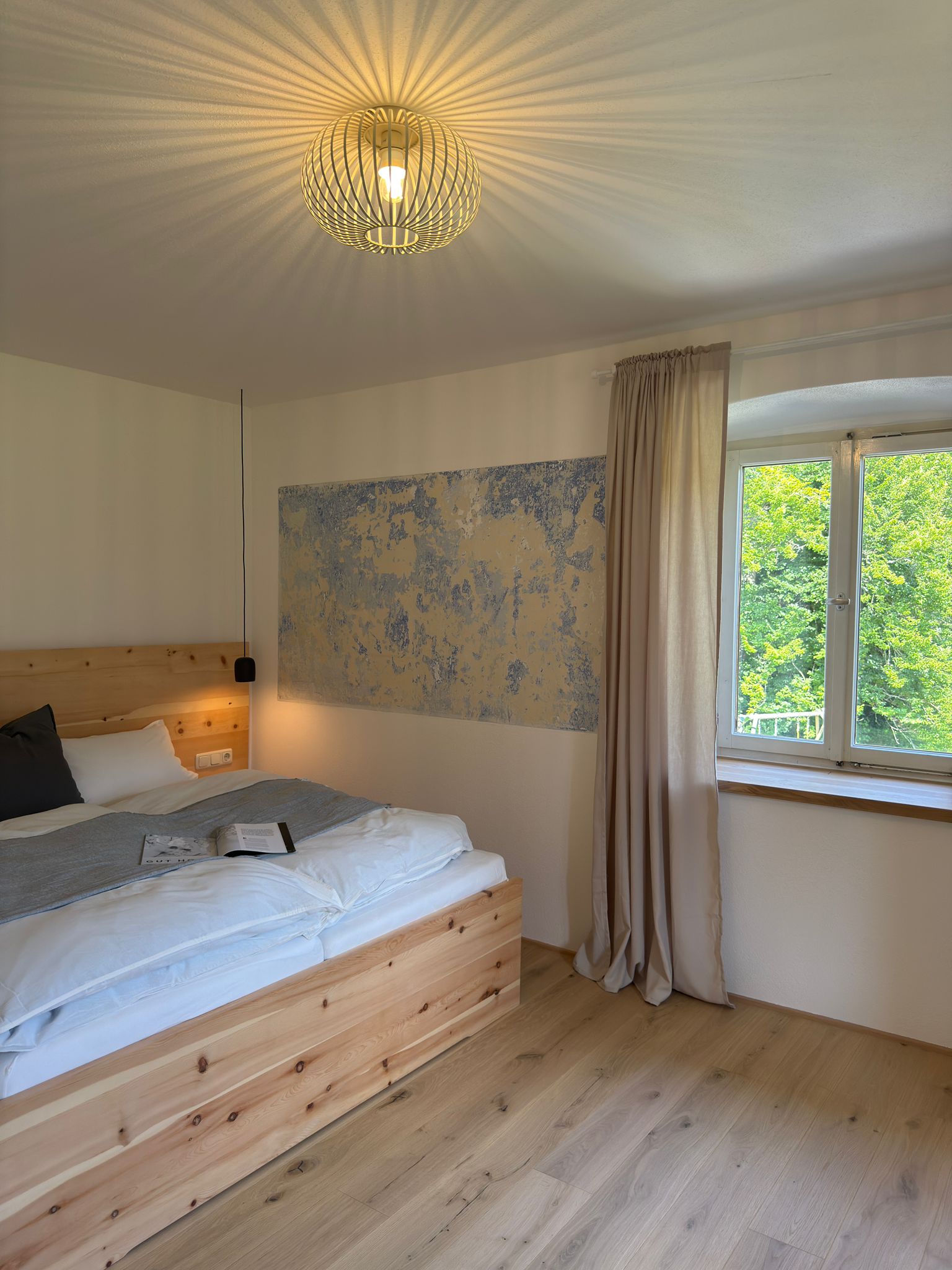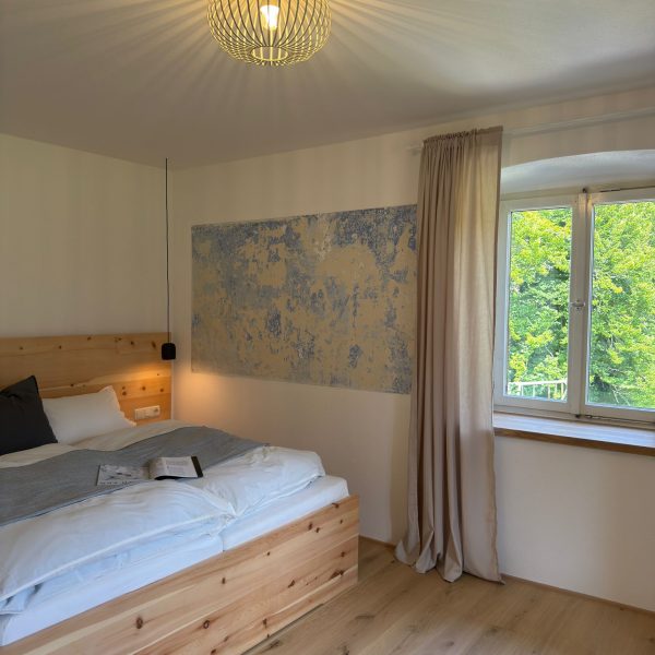 • Zwei großzügige Schlafzimmer mit je einem Doppelbett aus Zirbenholz 2,0 x 2,0 m